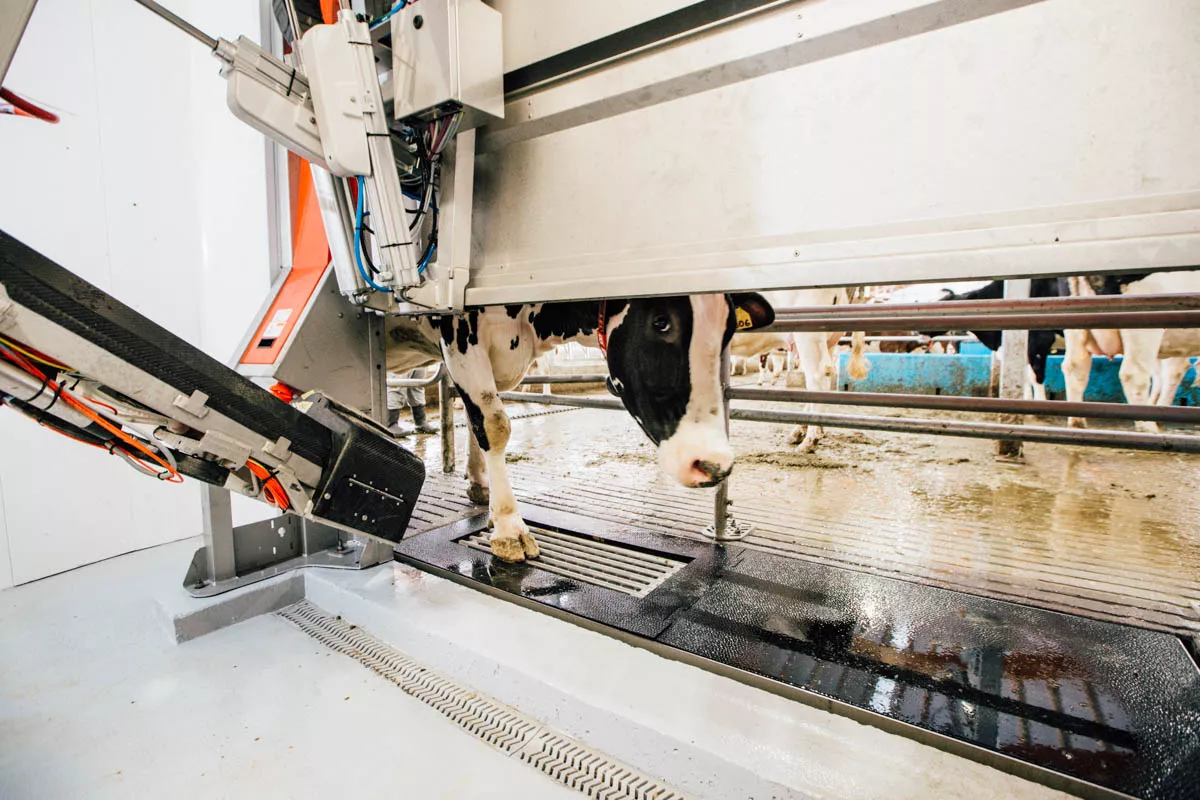- Автоматический доильный робот: Корова сама заходит в доильный бокс, где робот сканирует ее вымя и подключает доильные аппараты․ После доения робот дезинфицирует соски и выпускает корову․